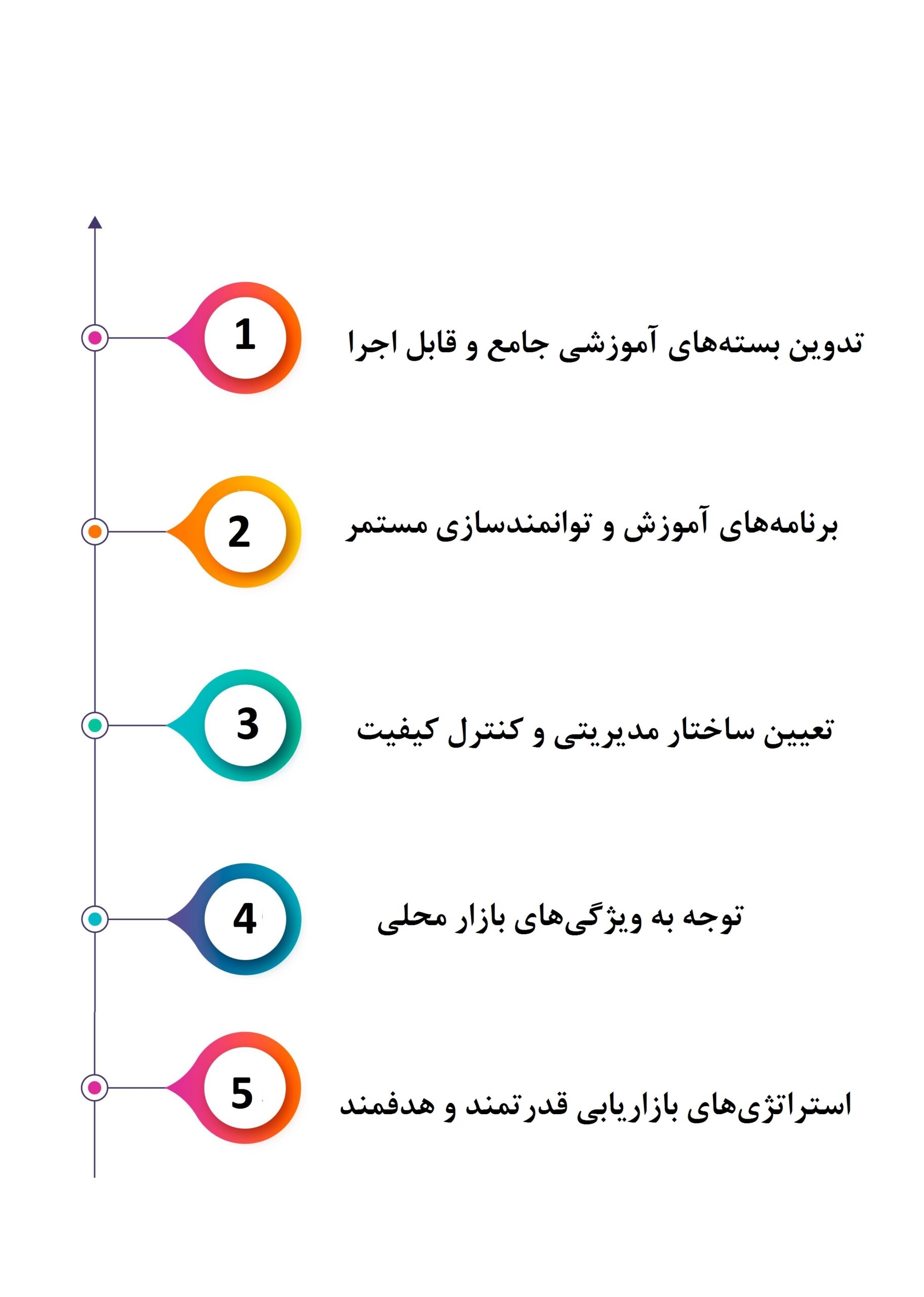 راهکار: انجام تحقیقات بازار مکرر، انعطافپذیری در ارائه محتوا با حفظ هسته اصلی استانداردها و توجه ویژه به ویژگیهای فرهنگی در رأس امور قرار گیرد.